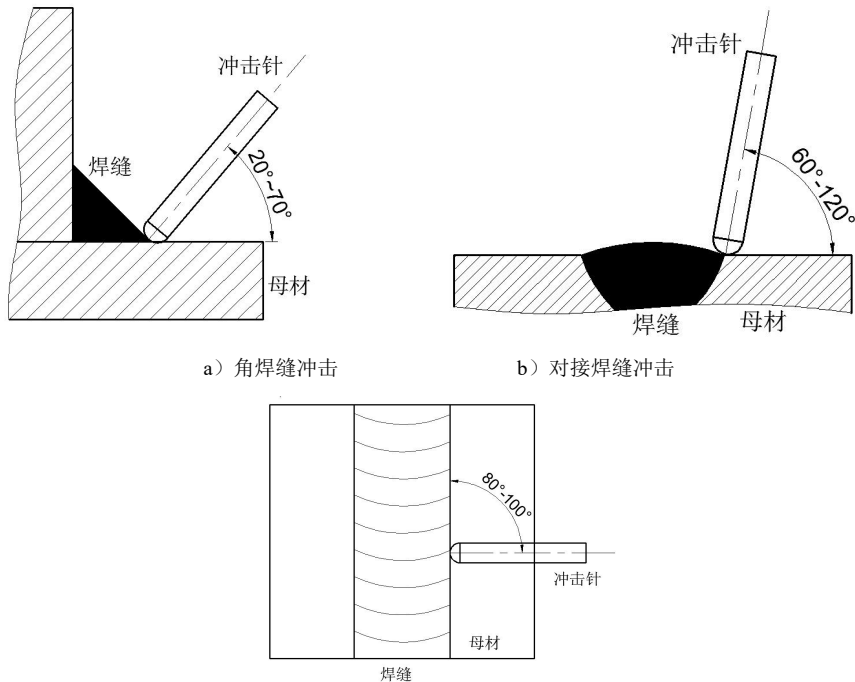 - 冲击针轴线与焊缝垂直(推荐角度见下图)。