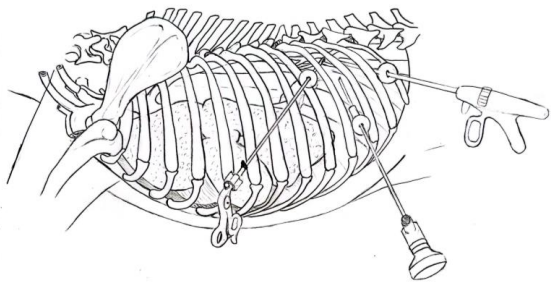 - 第一套管置于第10肋间胸壁中部,作5mm皮肤切口