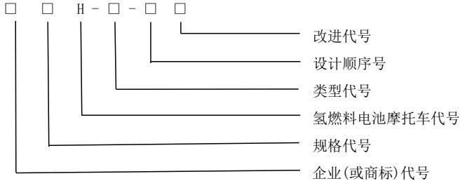 - 组成结构:企业代号(拼音首字母)+ 规格代号(电机额定功率,单位W)+ 氢燃料代号(H)+ 类型代号(GB/T 5375分类)+ 设计顺序号(1可省略)+ 改进代号(字母)。