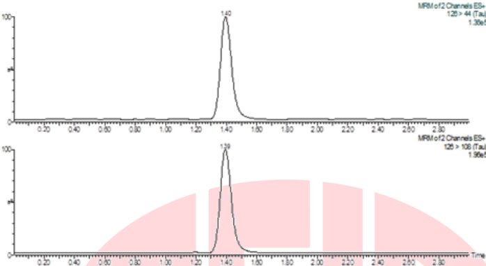 牛磺酸标准溶液监测离子对(MRM)色谱图见图B.1: