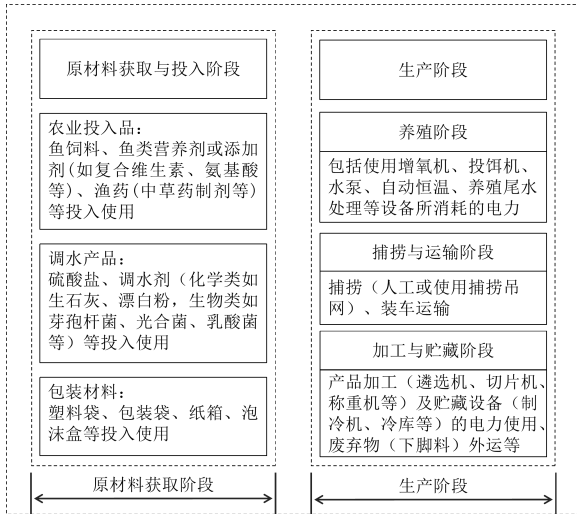 - 系统边界:从"摇篮到大门"的生命周期阶段,包括原材料获取与投入、原材料运输、生产(养殖、捕捞与运输、加工与贮藏)等阶段,但不包含养殖阶段生态系统的固碳排放